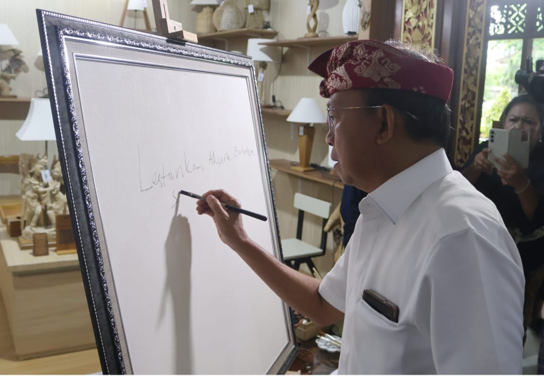 Sebelum acara pembukaan, Gubernur Koster berkesempatan menorehkan tulisan di atas sebuah kanvas. Kalimat “ Lestarikan Aksara Bahasa Sastra Bali” goresan tangan Gubernur Koster itu selanjutnya diproses menjadi kaligrafi selama acara pembukaan berlangsung.
